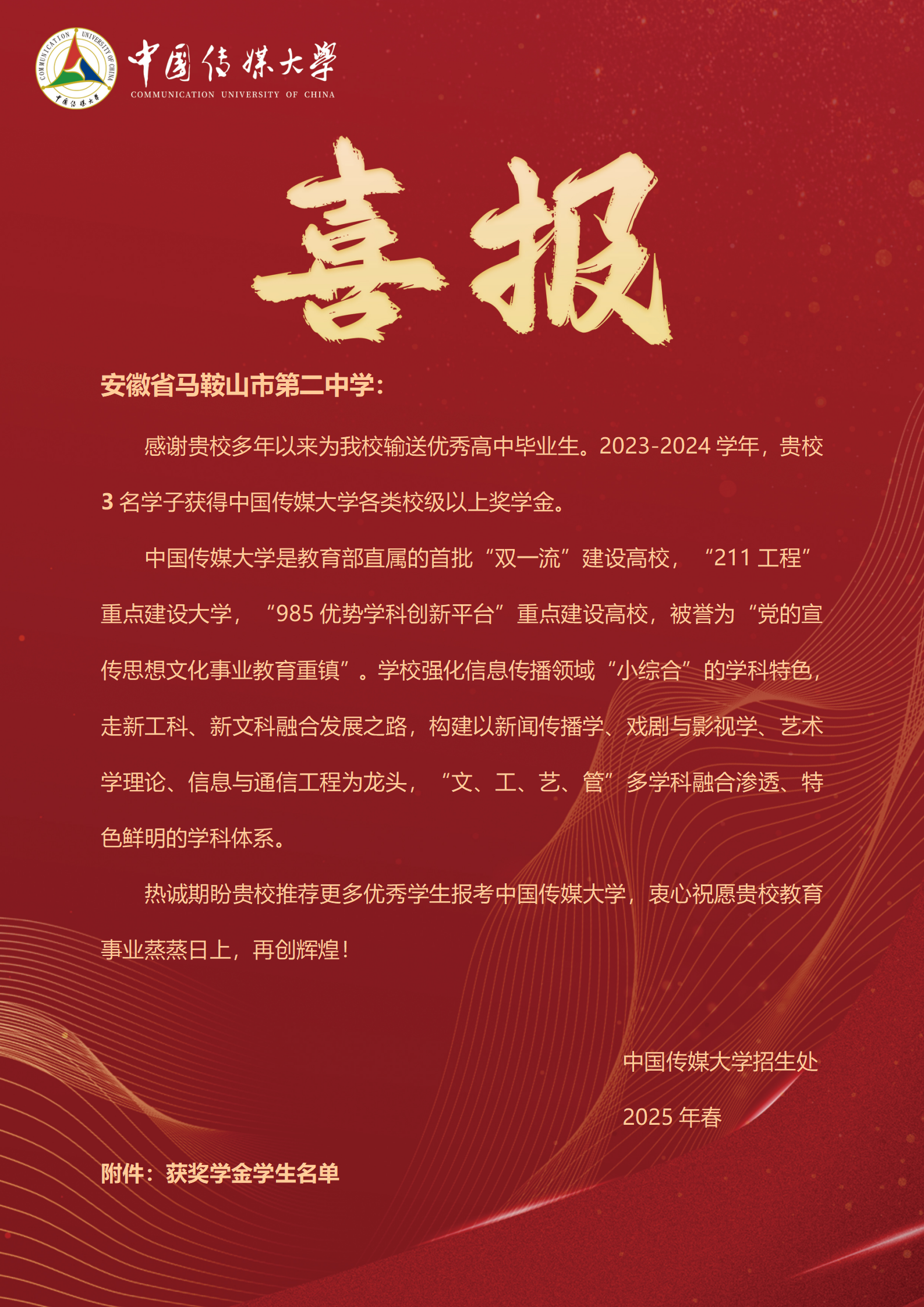 中國傳媒大學向我校發來喜報