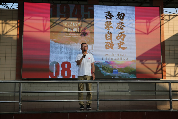 高(gāo)一年級部(bù)孫誌農主任代表年級部發言,並以“8·15”日本無條件投降紀念日為(wéi)主題作《勿忘曆史,吾輩自強》愛國主義教(jiāo)育講話。