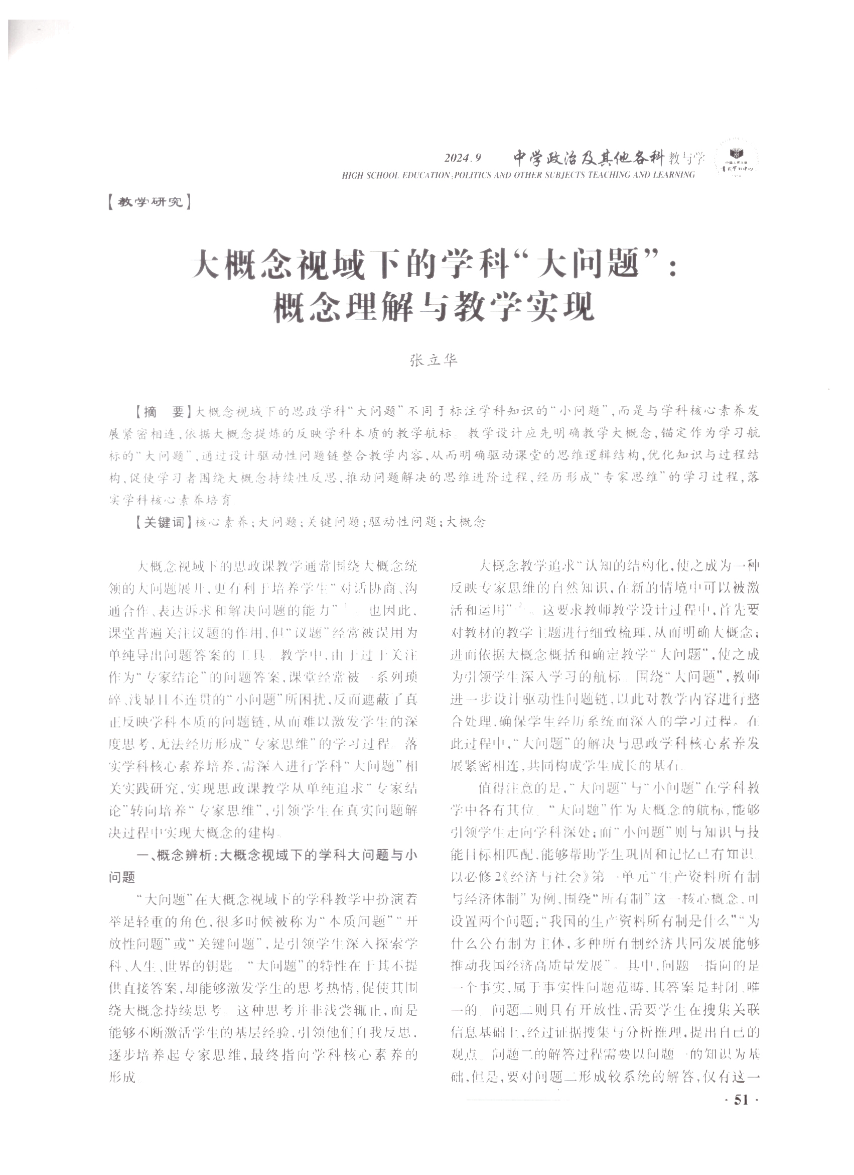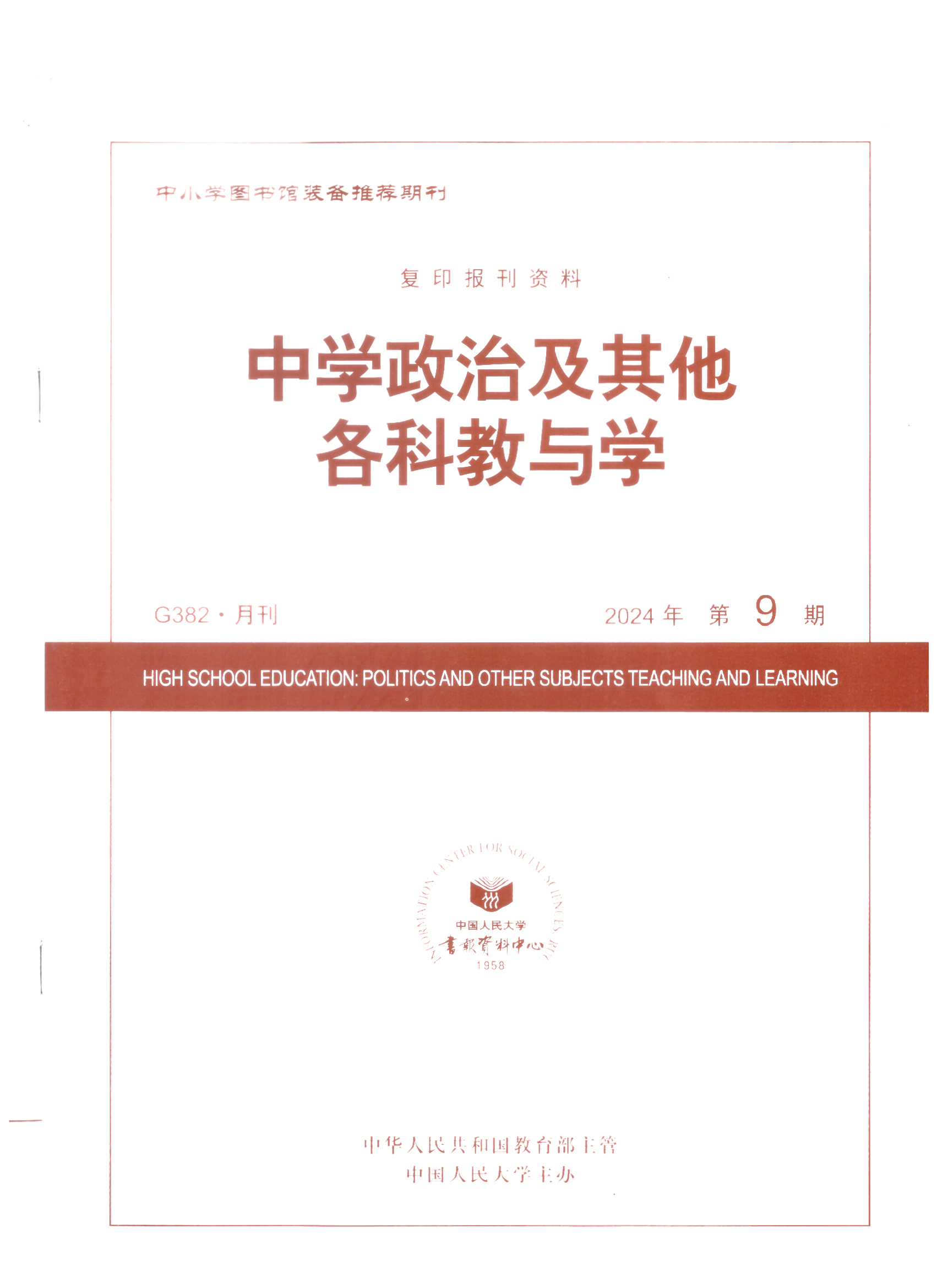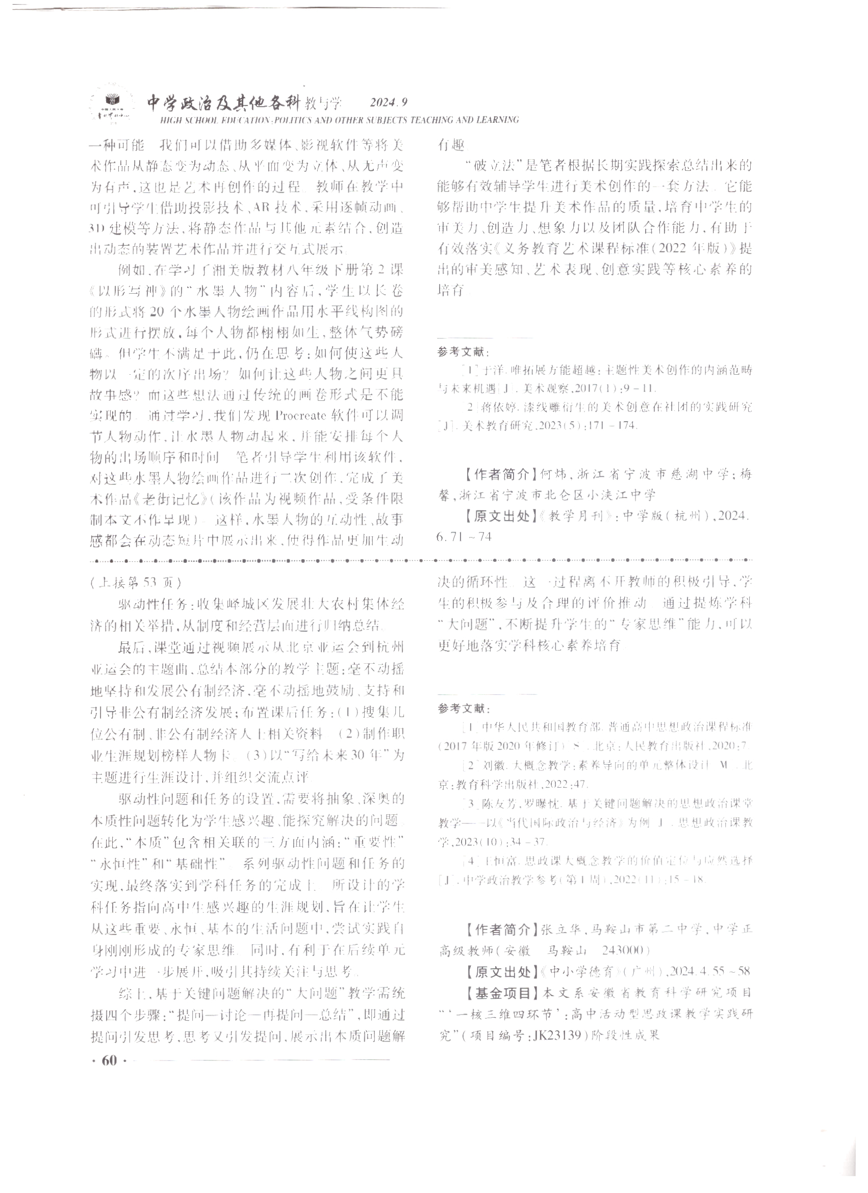 馬鞍山市大中小學思政教育一體化建設聯盟第四組成員單位馬鞍山市第二中學思政課教師張立華老師論文(wén)“大概念視域(yù)下的學科‘大問題’:概念(niàn)理解與教學實現”獲中國人民大學書報資料中心《中學政(zhèng)治及其它各(gè)科教與學》2024年第9期全文轉載。這是半年內張立華思(sī)想政治名師工作室圍繞大中小學思想政(zhèng)治教育一體化建(jiàn)設,精研“大概念”教學,產出的係列研究成果再(zài)次(cì)被人大複印全文轉載。