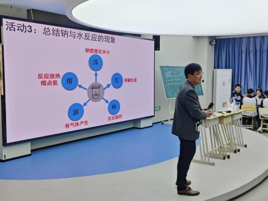 俞(yú)書(shū)紅老師執教《活潑的金屬單質鈉》這節課,聚焦化學核心素養,以有趣的“點水生火”小實驗開始,並指導學生完成一係列與(yǔ)鈉有關的實驗,同時(shí)引導(dǎo)學生對實驗(yàn)現象加以解釋。並且結合實驗現象,深入講解了鈉的物理性質和化學性質。同時結合鈉的性質以及鈉(nà)在生活中的實際應用,讓同學們認識到化學讓生活更(gèng)美好。
