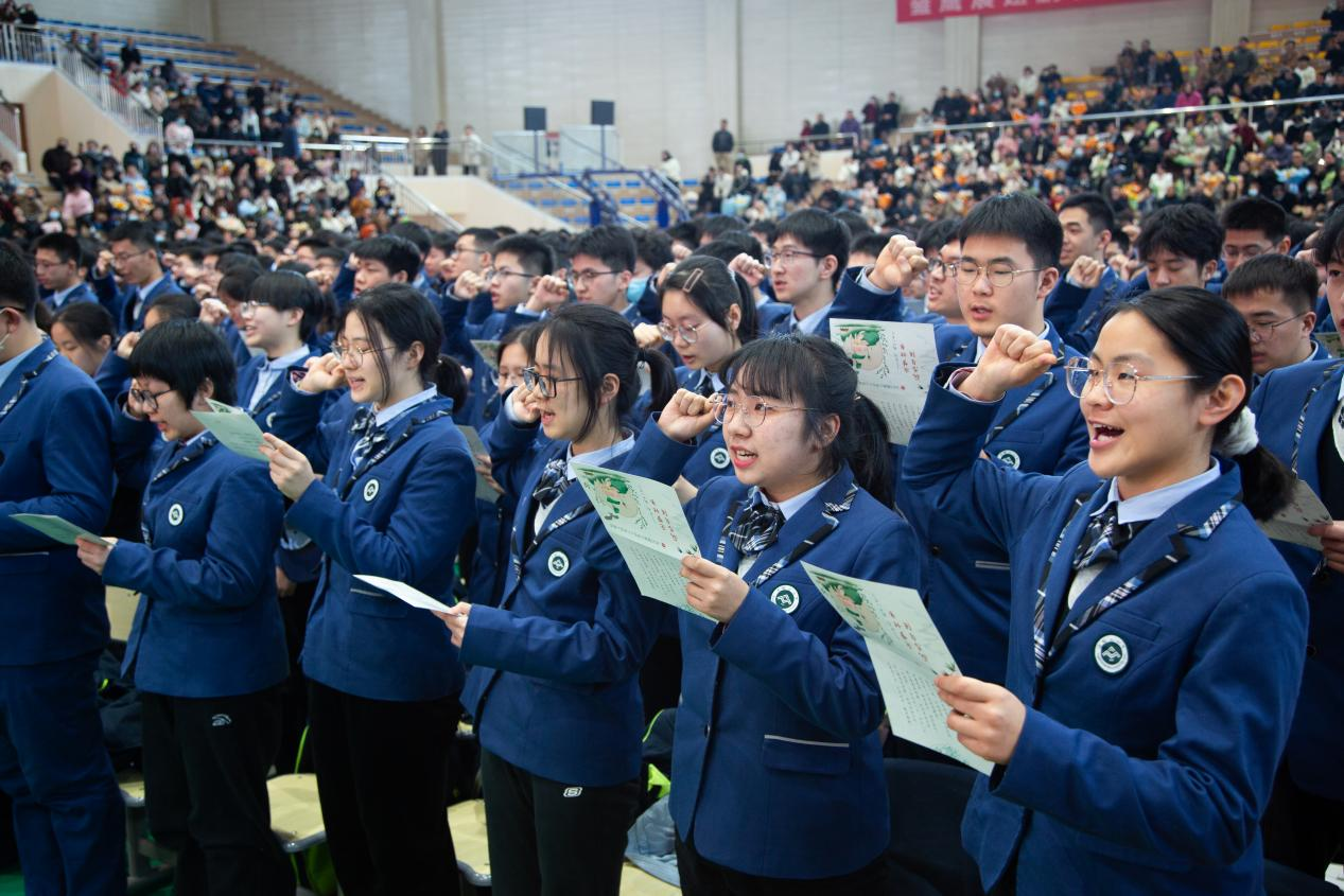 來自北大、清華等頂尖學府校友(yǒu)的寄(jì)語如春風化雨(yǔ),充滿鼓勵(lì)與期望,為正處於衝刺階段(duàn)的高三學子(zǐ)注入強大精神(shén)動力。學(xué)校領導贈送(sòng)的《憲法》,既是法治(zhì)精神的傳承,更是責任擔當的彰顯。當校(xiào)歌《校園的(de)雛鷹》旋律響起,“厚德 勵學 敦行”的(de)校訓在春日暖陽中熠熠生輝(huī)。
