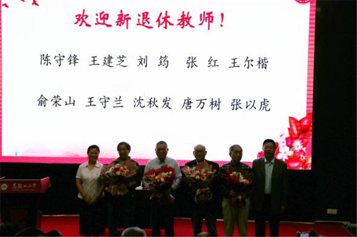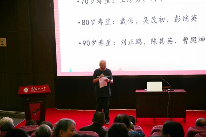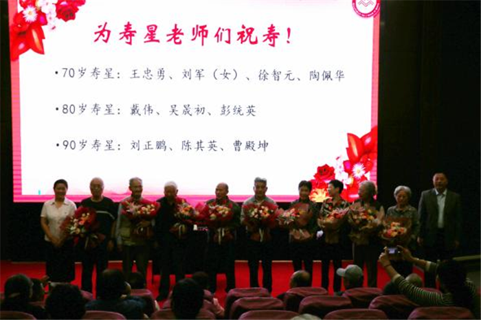 校(xiào)工會主席畢小紅同誌(zhì)宣讀了今(jīn)年新加入退教(jiāo)協的退休老(lǎo)師名單,並(bìng)向他們(men)表示了熱烈的歡迎,校黨委書記、校長王玉平同(tóng)誌和黨委副書記聶曉霞同誌向到場的(de)新退休(xiū)老(lǎo)師們獻花並合影留念。畢小紅主席宣讀了(le)今年的70歲、80歲和90歲壽星老師名單,大家集體為壽星們祝壽,校黨委書記、校長王玉平同(tóng)誌(zhì)和黨(dǎng)委副書記聶曉霞同誌向(xiàng)壽星老師們獻花、送壽禮。80歲壽星吳晟初老師作為代表講話,他向學校表達了深深的謝意,感謝學校領導對老年工(gōng)作的支持、對退休教職工的親切關懷,並表示雖已退休,仍要心係教(jiāo)育、心係二中,永遠做二中人,同時也要為當下一個十年的壽星而奮鬥!