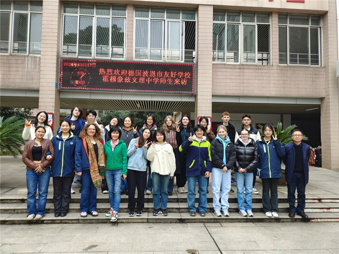 我校與德國波恩市霍穆豪茲文(wén)理(lǐ)中(zhōng)學於2010年建立友好關係。之後兩校開展(zhǎn)互訪活(huó)動(dòng),其中霍穆(mù)豪(háo)茲文理(lǐ)中學分別(bié)於2011、2013、2015、2017 和 2019 年來我校訪問交流。2020年受新冠(guàn)疫情影響,兩校的友(yǒu)好交(jiāo)流活動暫(zàn)時(shí)中斷。時隔四年,霍穆豪茲文理中學組織訪問(wèn)團(tuán)再(zài)次到訪我校。訪問團一行11人,其中9名德國(guó)學生將入住我校(xiào)高一學生(shēng)家庭,跟隨(suí)接(jiē)待家庭(tíng)學生(shēng)體驗中國中學課堂,體驗中華文化課程。
