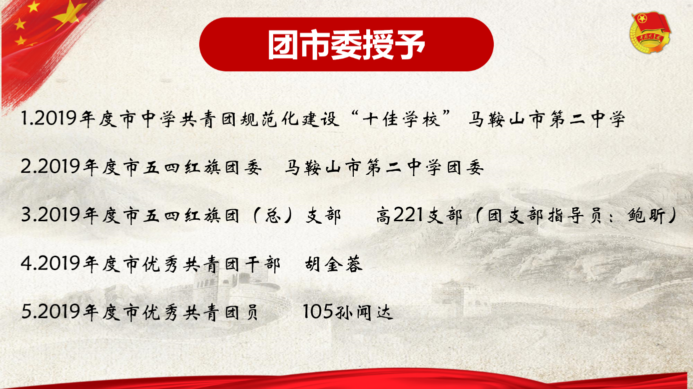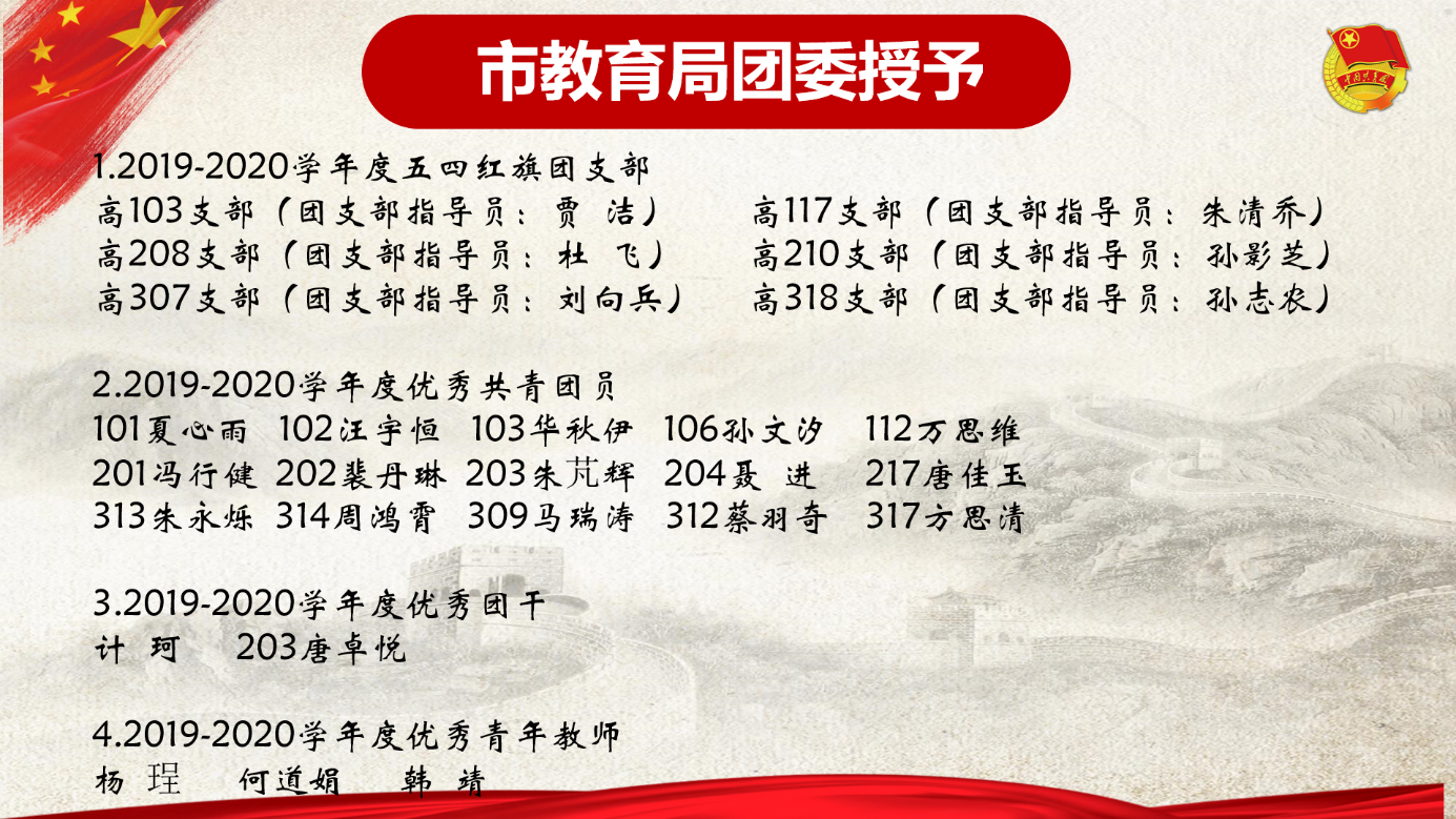 憶百年崢嶸歲(suì)月,銘永恒五四(sì)精神。學校(xiào)團委也於4月底全麵開展了我校2019—2020學年度“五四”先進集體和個人評優工作。現經班級團支部民主評選(xuǎn)推薦、年級部及(jí)有關部門評議審核,最後經學校研究,決定授予以下集體和個人2019—2020學(xué)年度馬鞍山市第二中學“優秀團支部(bù)”“優秀團幹”“優秀團員”“優(yōu)秀青年教師”的榮譽稱號(hào)。