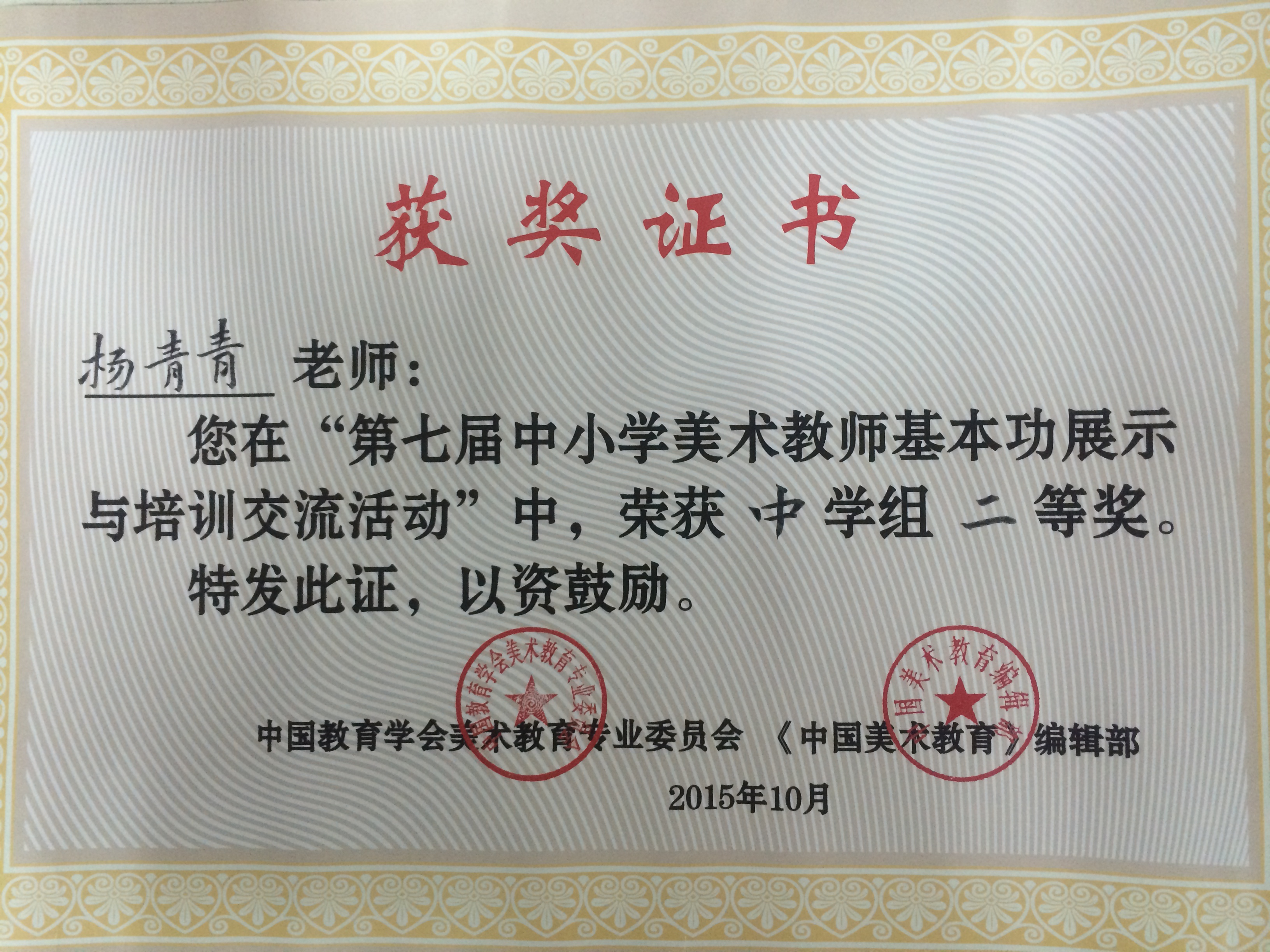 我校楊青青老師代表安徽省美術教師參加了在重慶四川美術學院舉辦的全國第七屆中小(xiǎo)學美術教(jiāo)師(shī)基(jī)本功比賽,通過美術理論答題、手工立體製作、色彩繪畫創作、國畫人物寫生、電腦招貼設計五項比賽。經過不懈努力,榮獲中學組二等獎的好成績,為學校也再添榮譽,特此祝賀!