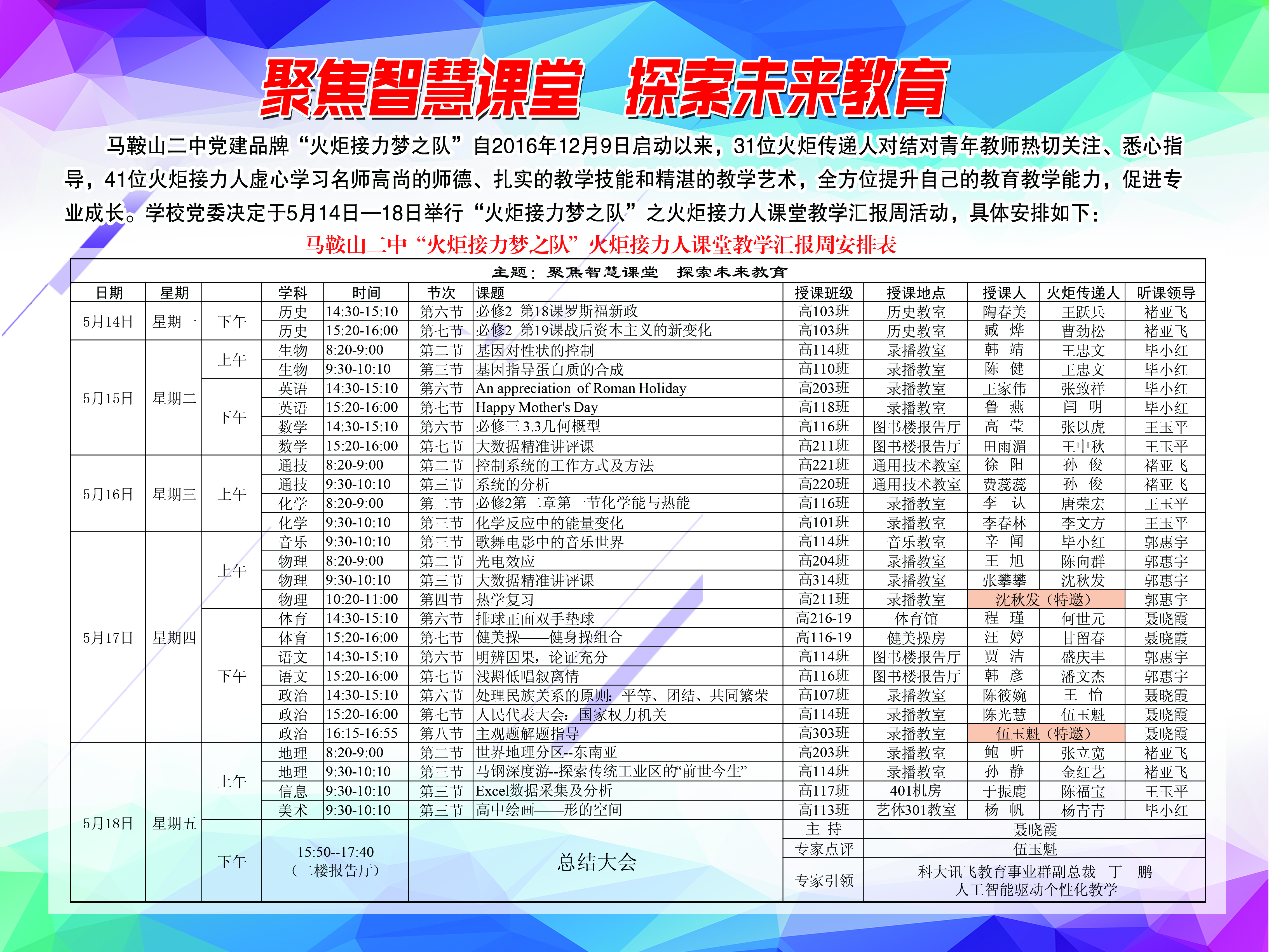 “火炬接力計劃”是馬鞍山二中教學傳(chuán)承的傳統平台,近兩年來(lái),在(zài)此(cǐ)基礎上打造的“火炬接力夢之隊”是馬鞍山二中黨(dǎng)建品(pǐn)牌,每學期進行一次為期一周的主題教學展示。本次活動的主題是“聚(jù)焦智慧課堂,探索未來(lái)教(jiāo)育”,由火炬接力人(rén)擔當探索(suǒ)未來教育(yù)的先鋒。活動共開設25節火炬接力人匯(huì)報課和2節火炬傳遞人示範課,其中有(yǒu)20節課利用智慧(huì)課堂平台進行教學。活動時間為2018年(nián)514日至18日,學科安排與市教研活動時間同步。