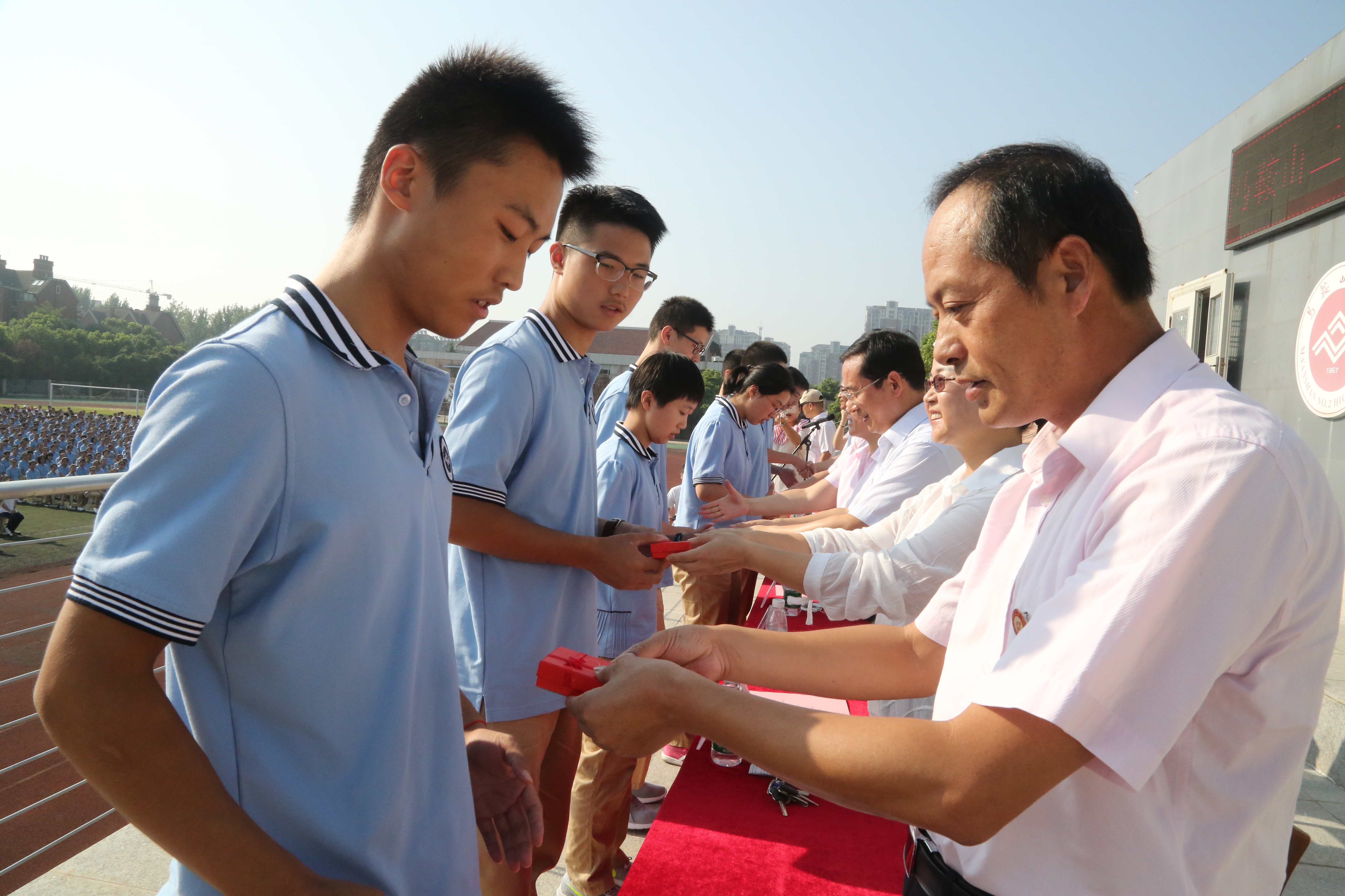 校領(lǐng)導為高一新生代(dài)表贈送校徽。