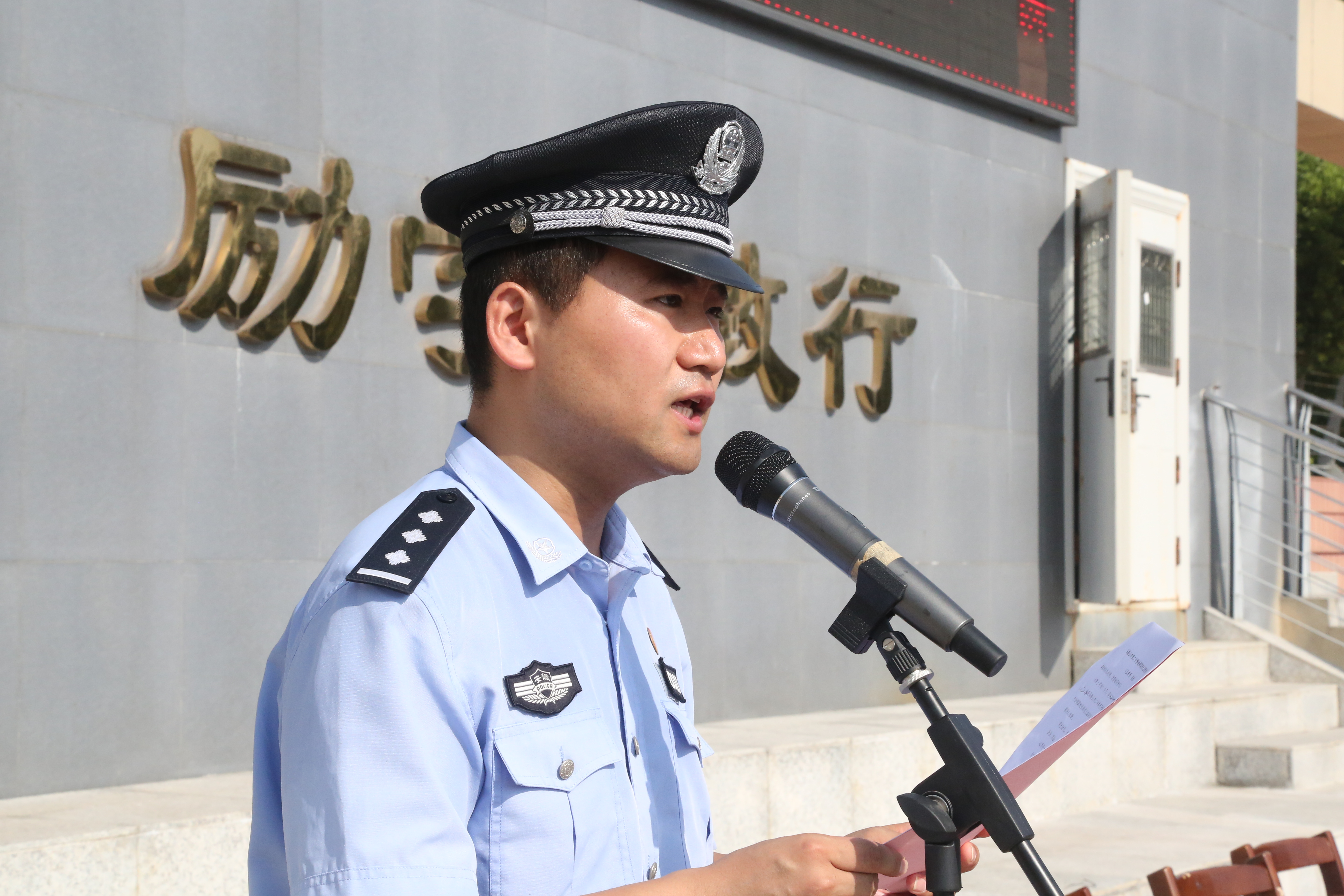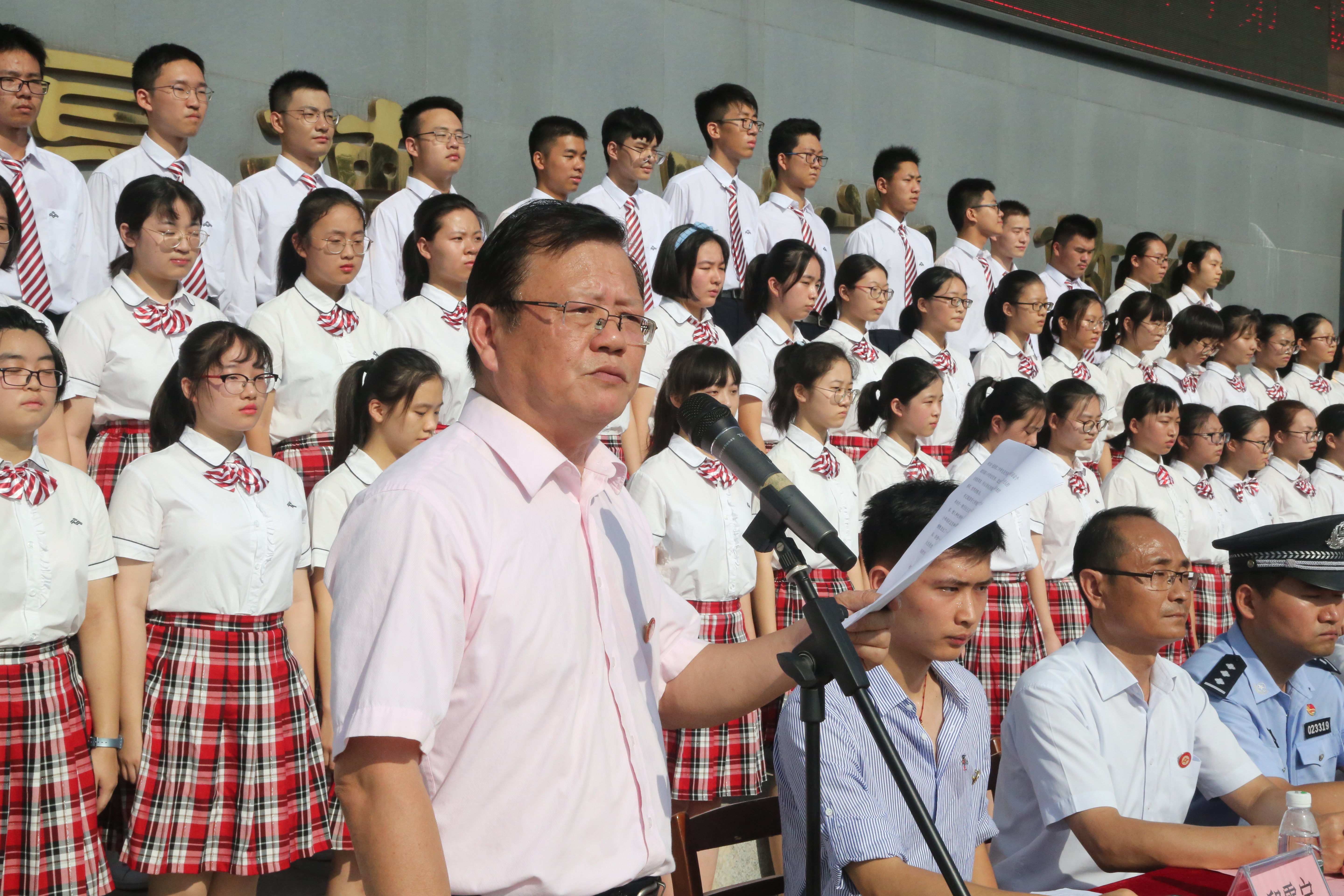 開學典禮(lǐ)結束後,我校法製副校長、江東派出所所長徐永給全校同學上開學第一課。