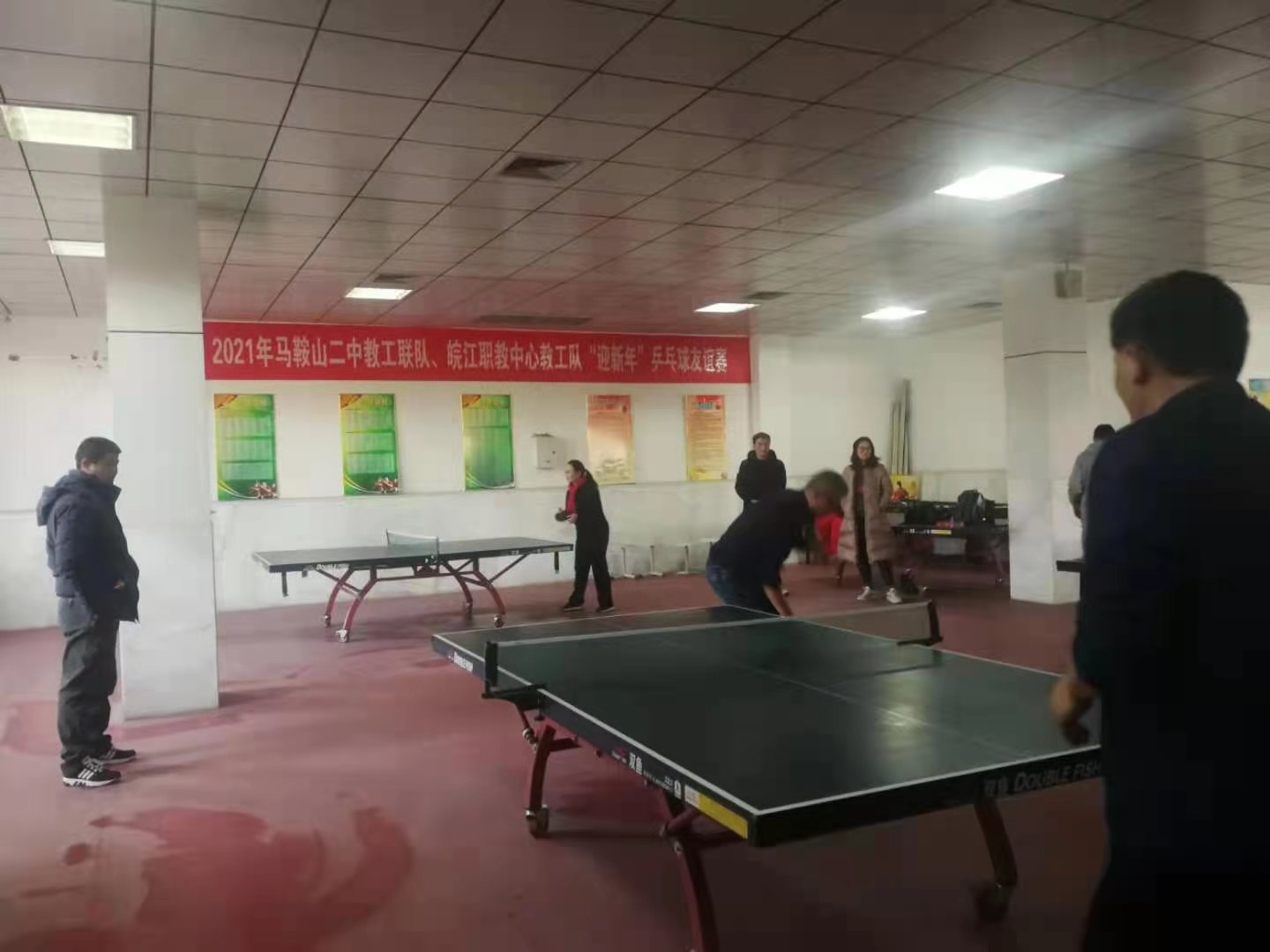 2021年1月7日下午,馬鞍山(shān)二中和馬鞍市皖江職教中心教(jiāo)職工(gōng)“慶(qìng)元(yuán)旦、迎新春”乒乓球友誼賽在我校乒乓球館(guǎn)拉開戰(zhàn)幕(mù)。下午2:30,雙方隊員們集合熱(rè)身,我校參(cān)加(jiā)比賽活動的(de)老師有:許二新、沈榮(róng)、施德東、孫濱、劉誌(zhì)發、韓靖、畢小紅、陳向群(qún)、汪紅、章(zhāng)明星。
