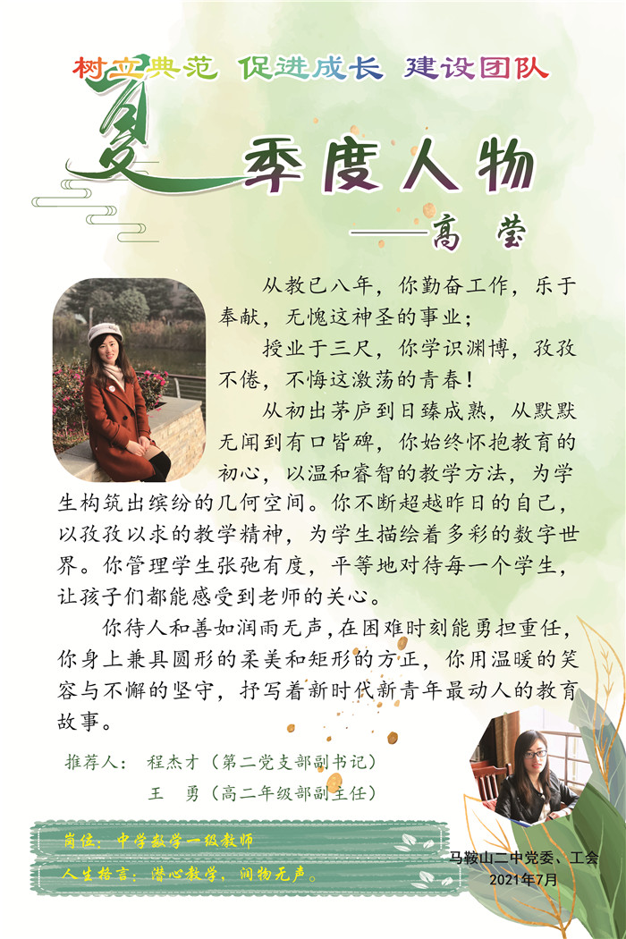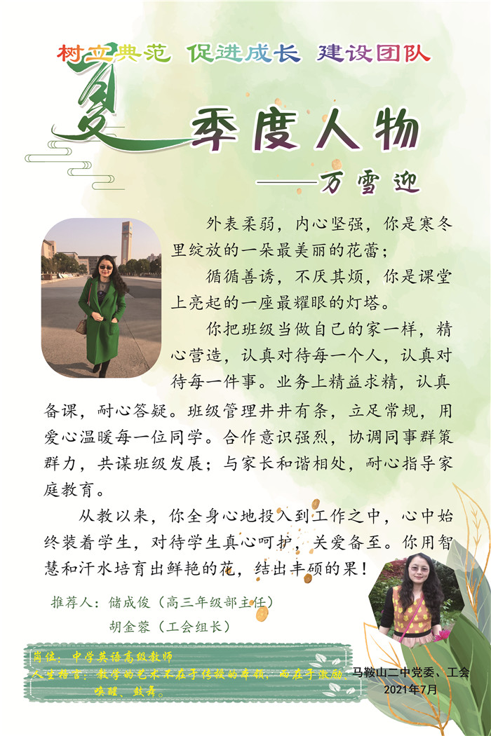 根據年級部、工會小組、資深(shēn)教師的推(tuī)薦,經過由工會委員、組長(zhǎng)組成的(de)推委會認真評(píng)審後,獲得2021年第(dì)二季度(dù)(總第二十六(liù)期)“季度人物”光榮稱號的(de)是:陳筱婉、萬雪迎、張攀攀、高瑩、張(zhāng)孝嚴、巫銳六位老師(shī)。