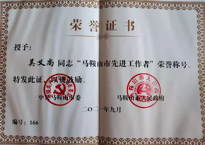 我校吳義尚老師獲得“馬鞍山市先進(jìn)工作者(zhě)”榮譽稱號,並(bìng)作為市(shì)先進工作者代表登台(tái)接受市領導頒獎。