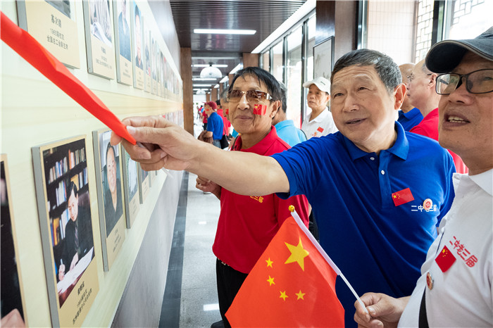 慶祝活動在莊嚴的國歌聲中拉開序幕,校友代(dài)表深情朗誦《二中賦(fù)》《沁園春·長沙》。