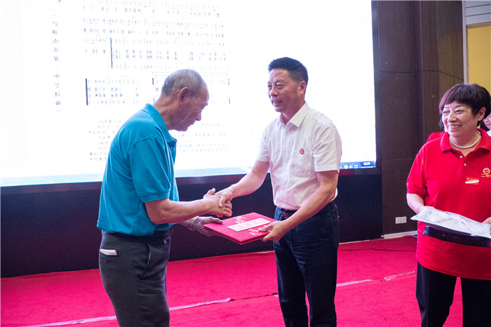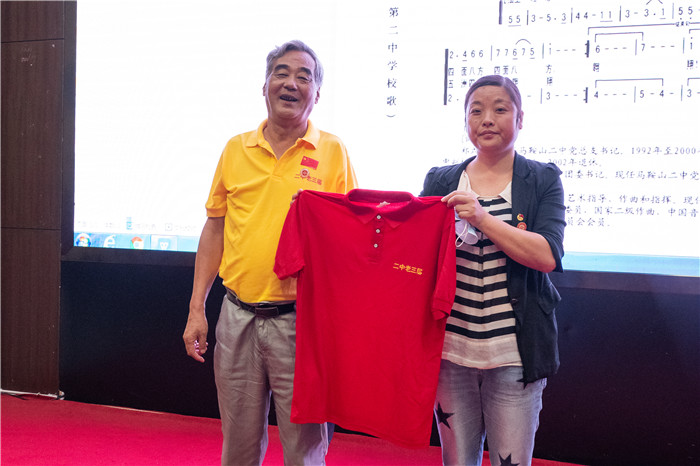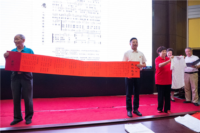 校友代表向學校贈送老三(sān)屆校友名冊、書法作品和活動文(wén)化衫。
