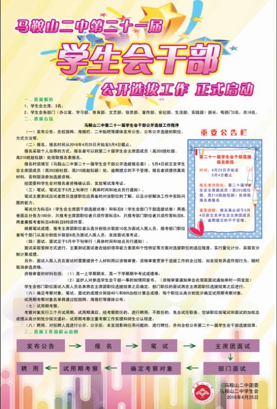 馬(mǎ)鞍山二中第二十一(yī)屆學生會幹部(bù)公開選拔(bá)工作程序