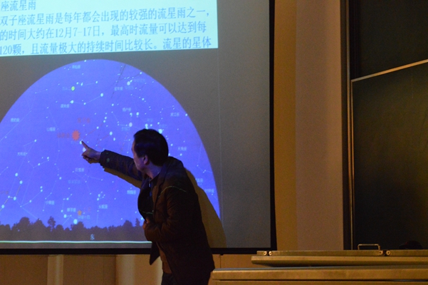 2016年12月7日中午一點,在階梯教室內,座無(wú)虛席。他們都是慕名前來聽盧大亮(liàng)老師關於雙子座流星雨講座的學生。