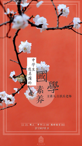 本周三中午,崇寧國學社在階梯教室舉(jǔ)辦了在社團文化月的第二(èr)次國學講(jiǎng)座,由王(wáng)躍兵老師主講。講座的(de)主題是(shì)《中學生應當具備(bèi)的國學素養》。