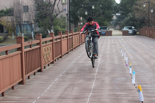 馭火單車社的活動在五環橋上進行,兩個活動都是比賽,其(qí)一是比誰騎得慢(màn),其二是障礙賽(sài),活動期間還有單車社成員表演特技,同學們還可以在這裏借自行車在學校裏麵兜一圈。