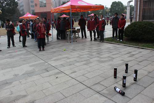 知行網球組(zǔ)的棚前排(pái)起了(le)長長的(de)隊伍,參與的同學要用網球打倒排列在地上的筒子,每人有五個(gè)球的機會,如果打倒了三個(gè)筒即可獲得獎品。