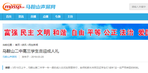 3月20日,馬鞍山聲屏網(馬鞍(ān)山(shān)廣播電台)報道了我校成人典禮。