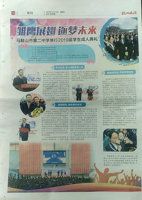 3月19日(rì),《皖江晚報(bào)》整版報道我校成人典禮。