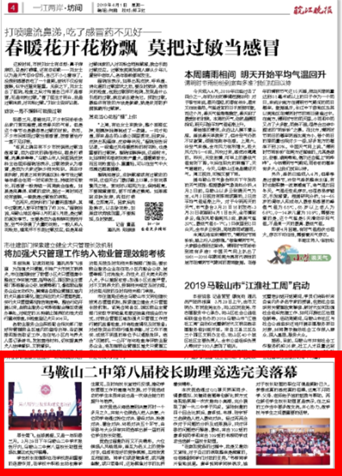《皖江晚報》4月1日第四版報道了我校學(xué)生校長助(zhù)理競選活動。