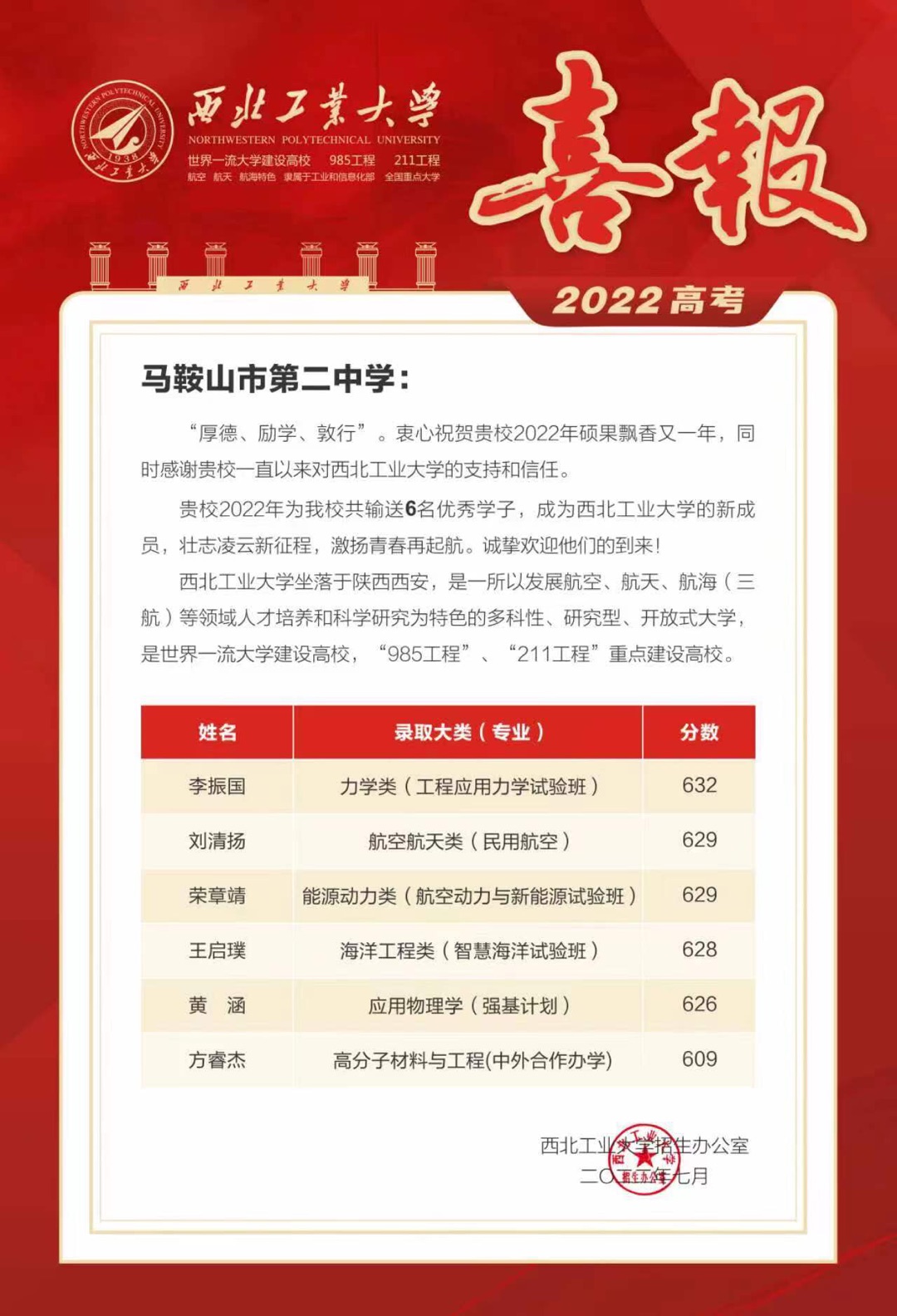 西北工(gōng)業大學向我校發來喜報