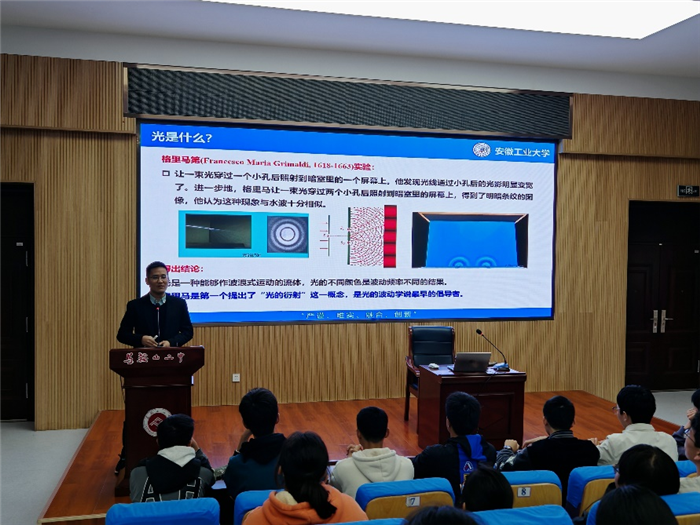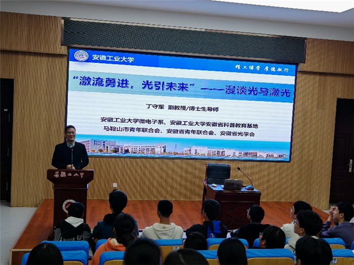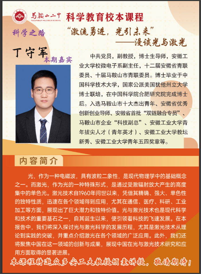 繼“科學教育進校園”係列課程首講收獲熱烈反響後,馬(mǎ)鞍(ān)山二中於近期再度為學子們搭建起接(jiē)觸前沿科技的橋梁(liáng)。本次活動特(tè)邀安徽工業大學校微電子係副主任丁守軍副教授主講,以“激流勇(yǒng)進,光引未來”——漫談光與激光為主題(tí),帶領同學(xué)們走進光與激光的奇妙世界,開啟一場兼具科學(xué)性與趣味(wèi)性的探索之旅。