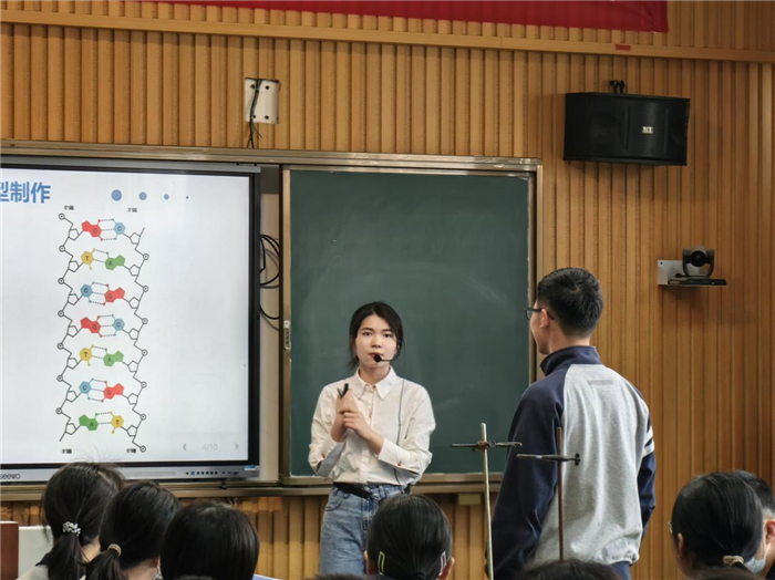 張貝老師所授課題為《3.2 製作DNA雙螺旋結構模型》,她以北京冬奧會“五環廊橋”設計為導入,引導學生從(cóng)單體-單鏈-平麵結構-立體(tǐ)結構的遞進層次構建DNA雙螺旋結構模型,發揮學生的主觀能動性,提高動手能力,在(zài)實踐中培(péi)養科學思維及探究能力,同時加深對理論知識的理解,體驗小組合作的重要性。