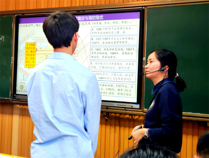 張文文老師以盛世之“疆”、“治”、“危”三個(gè)板塊,條理(lǐ)清晰地分析清朝的鼎盛與危機,張老(lǎo)師還通過文字、圖片、視頻等多種史料創設問題情境,引導學生深入思考。