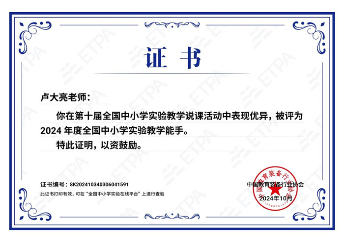 2024年11月8日,由教育部基礎教育司主(zhǔ)辦的第十屆全國(guó)中小學實驗教學說課活動已圓滿結束。本次活動主要有兩個環節,一是遴選實驗教學說課案例,二(èr)是現場(chǎng)說課展示。我(wǒ)校盧大亮老師在活動中表現優異,被評為2024年度全國中小學實驗教學能手。盧老師精彩紛呈的說課和專家們專業(yè)深入的點評(píng),為現場(chǎng)眾多觀摩學習者提供了優質的體驗。