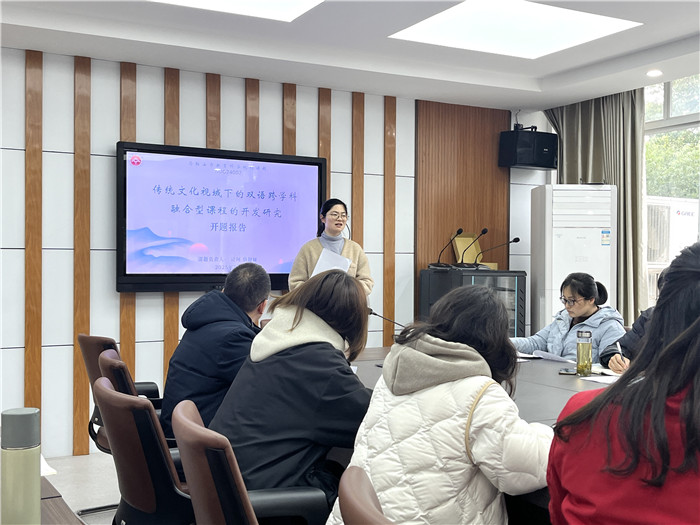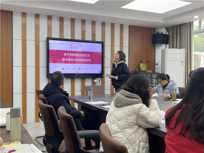 首先由市級(jí)規劃課題《傳統文化視域(yù)下的雙語(yǔ)跨學科融合(hé)型課程的開發研(yán)究》的負責人計珂老師(shī)進行開(kāi)題匯報,共同負責人唐舒婭老師作補充(chōng)。隨後,《高(gāo)中(zhōng)英語課(kè)堂中國文化教學現狀與實施策略研究》的負責人盛涵老師宣讀課題組開題報告,共同負責人施瑋老師(shī)作補充。
