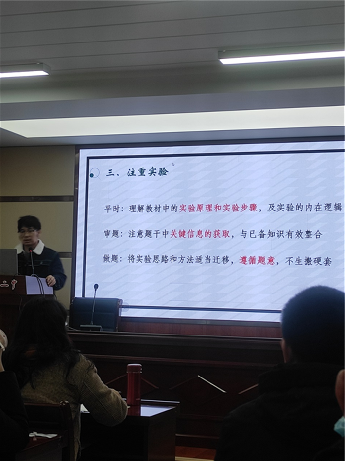 馬鞍山二中韓靖老師分享適應性考試的命題心得,從命題人的角度指(zhǐ)導複習過程。他認為,學生需全麵閱讀教材、重視新老教材的差異、注重實驗、長句作答需邏輯嚴謹,使用專業術語,避免口語化。