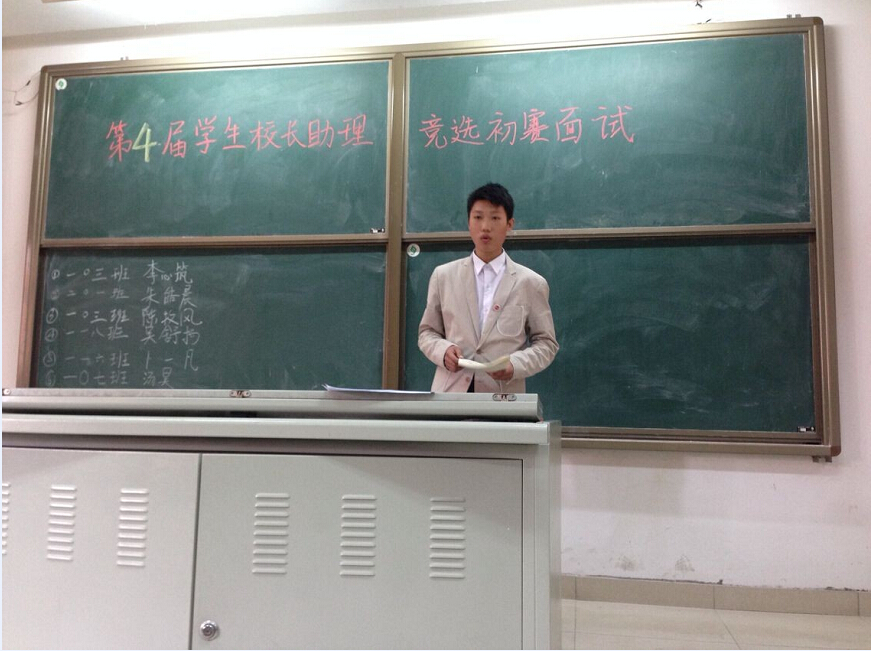10月(yuè)24日,一連數日秋雨纏綿洗出難得(dé)的天高雲淡。風輕日暖(nuǎn),晴空長雁,中午(wǔ)12時40分,2014屆學生校長助理競(jìng)選的麵試部分正式於南教學樓一樓階梯教室拉開序幕。