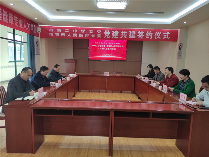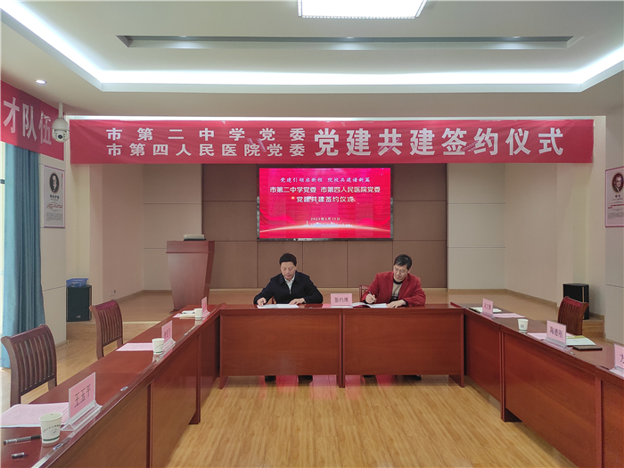 市第四人民醫院黨委(wěi)書記方金勇,黨(dǎng)委副(fù)書記、院(yuàn)長王雪倩,黨委(wěi)委員、副院長陶德剛,市第二中學黨委書記、校長王(wáng)玉平(píng),黨委委員、副校長褚(chǔ)亞飛,黨委委員、副校長慶曉(xiǎo)出席簽約儀式。