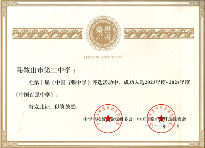 2023年12月20日,由中學名(míng)校校長(zhǎng)論壇組委會(huì)、品牌時代國際傳媒聯合國內主流教育媒體共同推出的“中(zhōng)國百強中學”發布會在北京舉行(háng),馬鞍山二中(zhōng)榮獲“第十屆中(zhōng)國百強(qiáng)中(zhōng)學”,這也是馬鞍山二中再次(cì)獲此殊榮。副(fù)校長孫(sūn)濱代表學校參加此次會議。