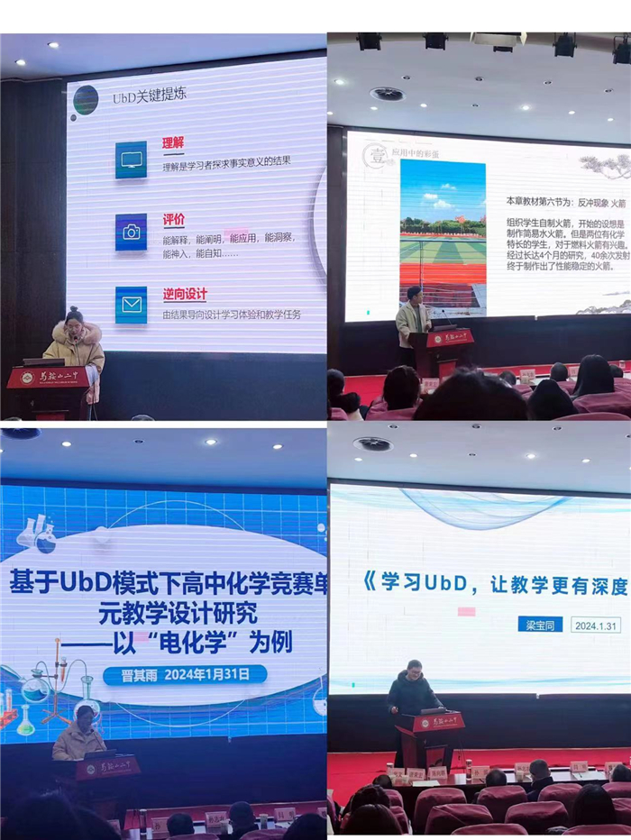 本學年青年教(jiāo)師閱(yuè)讀學(xué)習的教育學專著是由美國教育專家(jiā)格(gé)蘭特·維金(jīn)斯和傑伊(yī)·麥克(kè)泰格所著的(de)《追求理解的教學設計(UbD)》。8位青年教師結合自身教(jiāo)學實踐,分享了自己的學習心得,依次(cì)發表主題演講。數學組徐晨陽老師(shī)以《利用單位圓的性質研究正餘弦函數的性質》為例,突顯理解的可遷移性,分析學生的潛在誤解,強調學生誤解的(de)價值不僅僅是一個需要教師糾正的錯誤,更能揭示學生問題、疑問、假設以及隱藏在(zài)字麵描(miáo)述之外的未知領域,進而有效指導教師後(hòu)期(qī)教學。語文組劉鬱欣老(lǎo)師從一堂“安靜”的公開課的教學(xué)反(fǎn)思入手,基於UbD的備課流程,重新設計逆向教學設計,通過基於理解的大單元設計學習評價表、單元任務、表現性(xìng)任務設計,落(luò)實課程標準,重視學生的發展。物(wù)理組萬知非老(lǎo)師基(jī)於UbD理論的“動量守恒定律”來落實大單元教(jiāo)學實踐,講述學生團隊(duì)長(zhǎng)達4個(gè)月(yuè)的研究(jiū)。40餘次發射之後,學生終於製(zhì)作出性能穩定的火(huǒ)箭,一舉獲得中國科學技術大學(xué)“瀚海計劃”一等獎。萬老師展示了通過調動學生學習興趣,來喚醒學生對知識點全(quán)方位體驗的無限(xiàn)潛力(lì)。化學組晉其雨老師以“電化學”為例,分享(xiǎng)了基於UbD模式下高中化學競賽單元教學(xué)設計研究,糾正“灌輸式”教學和活動導向教學中(zhōng)沒有目標的學習和教學(xué),強調逆向設(shè)計應從學生需求出發(fā),教師需要重(chóng)證據(jù)、重理(lǐ)解、重遷移,讓學生時刻明白(bái)自(zì)己(jǐ)的目(mù)標和方法……青年老師們(men)立足本學科具體內容,結合(hé)UbD教育理論,既(jì)挖掘了(le)本專業教與研的深度,又拓展了跨學科視野(yě)。