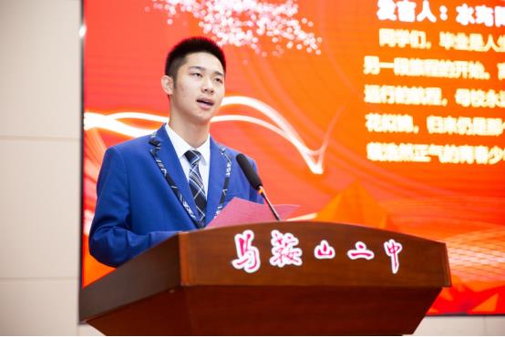 畢業生代表305班水璵陽同(tóng)學回顧了(le)他在馬二求學的心路曆(lì)程(chéng)。失意,迷茫,奮發,成功…從輕狂到沉穩,從懵懂到成熟,是(shì)馬二鍛造了他的(de)自信和堅強,鑄就他的青春和夢想(xiǎng)。臨別(bié)之際(jì),水璵陽同(tóng)學代表全體學子表示:永(yǒng)遠保(bǎo)持堅(jiān)韌,積極(jí)迎接每(měi)一個挑戰,不(bú)負韶華,不(bú)負家國。