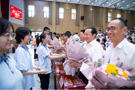 最後(hòu),學生(shēng)代表向三年來陪伴他們成長的各位(wèi)領導、嘉賓和高三全(quán)體老師獻上鮮花。