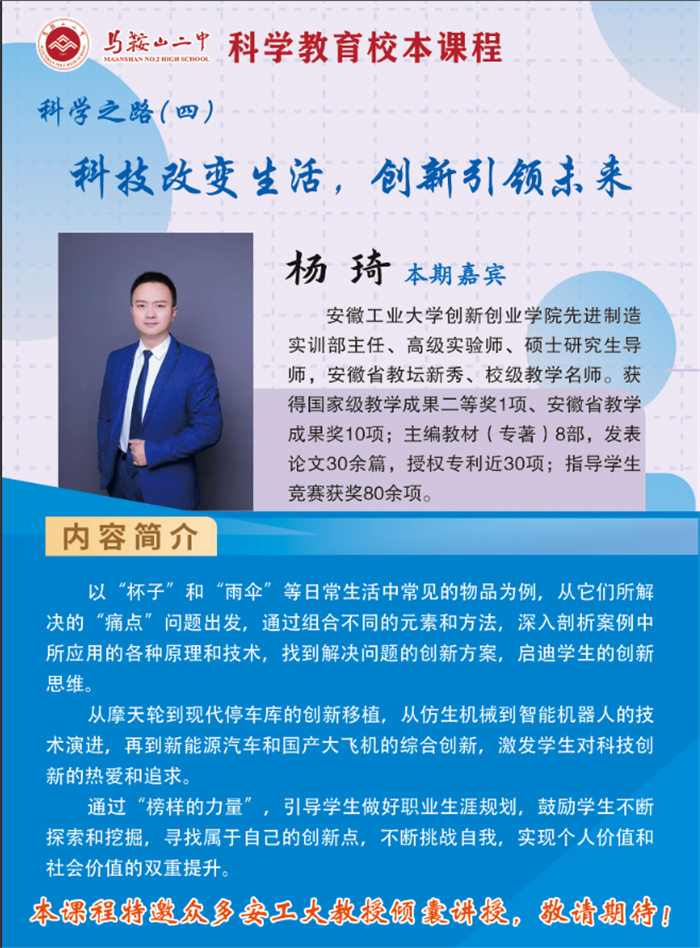 4月1日,馬鞍山二中與安徽工(gōng)業大學(xué)繼續深化合(hé)作,成功舉辦(bàn)了科學教育第四期講座。本次講座特邀安徽工業(yè)大學創新創業學院先進製造實訓部主任、高級實驗師、碩士(shì)研究生導師楊琦擔任主講嘉賓,為(wéi)二中學子帶來(lái)了一場題為《科技改變生活,創新引領未來》的精彩(cǎi)報(bào)告。楊琦主任以其豐富的實(shí)踐經驗和創新(xīn)思維,帶領(lǐng)學生們(men)領略了科技創(chuàng)新的魅力。