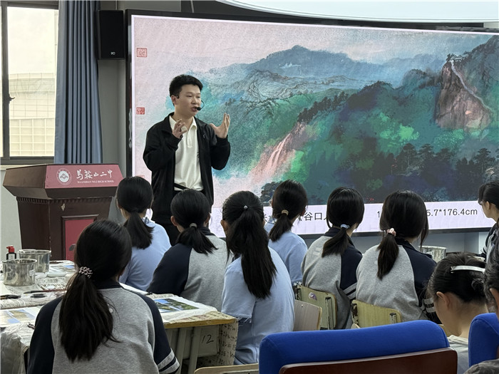 第二節課由高聖乾老(lǎo)師帶來的校本課程《墨彩江東——詩城中的大千世界》,他帶領學生欣賞(shǎng)馬鞍山的風景名勝(shèng),用潑墨(mò)技法啟發學生表現(xiàn)家鄉美景(jǐng),教師(shī)現場示範潑彩技法,語言(yán)幽(yōu)默,課(kè)堂氛圍輕鬆。學生大膽嚐試,揮毫潑墨。本節課不僅(jǐn)拓展了(le)對自然山川美景的認知,更加培養了學生敢於實踐的藝術表現能力。