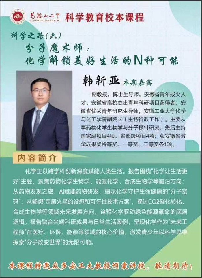 4月29日,馬鞍山二中(zhōng)與安徽工業大學聯(lián)合舉辦了科學教育第六(liù)期講座。本次講座特邀安徽工(gōng)業大學化學與化工學(xué)院副(fù)院長(主持工作)、博士生導(dǎo)師韓新亞教授擔任主講嘉賓,為二中學子帶來了一場題為《分子魔術師:化學解鎖美好生活的N種可能》的精彩報(bào)告。韓新亞教授以(yǐ)其深厚的(de)學術造詣和(hé)豐富的實踐經驗,帶領學生們深入探索了化學在日常生活與未來科技中(zhōng)的無限可能。
