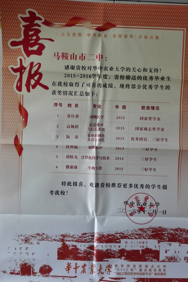 您(nín)現在的位置:首頁 - 新聞(wén)中心 - 校園新聞 - 華中農業大學喜報