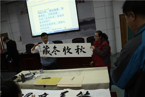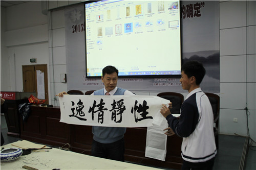 百川先生與同學們幽默地交談著,表現(xiàn)得十分親切。他贈與同學幾幅親自書寫(xiě)的《千字(zì)文》的名句(jù),字遒(qiú)勁有力,寓意深遠,讓同學們在感歎書法之精(jīng)美的同時,也能進一步了解《千字文》的絕妙。不得不說的是,二中學校藏龍臥虎,高一(3)班俞(yú)悅同學(xué)受到大家的鼓動,也上台(tái)揮墨寫下文中的“秋收冬藏”四字,筆畫剛勁不失大方,厚重頗露氣場。一筆至終,絲毫不得大意,分厘不可懈慢,善始善終。