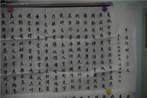 百川先生十多年來,用“木鋸繩斷,水(shuǐ)滴石穿”的毅力,足(zú)足寫了1800多遍行書《千字文》,以此作例教育學生們做事專一,鐵杵也將磨(mó)成針。