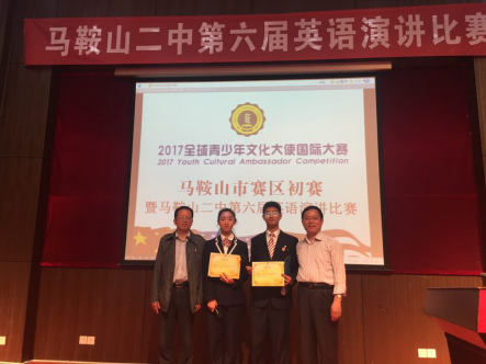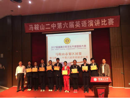 2017年4月17日下午,2017全球青少年文化大使國際大賽馬鞍(ān)山市賽區初賽(sài)暨馬鞍山二中第六屆英語演講比賽在校圖書館一樓(lóu)報(bào)告(gào)廳圓滿結束。本次比賽特邀劉建英老師(shī)、吳宗(zōng)彥老師、高桂鳳老師、施瑋老師和(hé)方亞婷老師擔(dān)任評委(wěi),主持人由高一(3)班的阮庭萱同學和高一(2)班的丁一葦同學擔任。比(bǐ)賽分為兩個環(huán)節:主題演講和才藝展示。來(lái)自高一年級19個班的選手們各施(shī)其能(néng),他們流(liú)利的英(yīng)語口語和非凡的舞台表現使(shǐ)得本次比賽精彩不斷,無論哪個環(huán)節(jiē)對(duì)在場的師生而言都是一次絕妙的視聽盛宴,現場氣氛熱烈,掌聲如潮。比賽最終評出一等獎九名同學,二等獎十名同(tóng)學,英語教研組組長閆明老師和高一英語備(bèi)課組組長唐曉(xiǎo)文老師為選手們頒發了榮譽證書(獲獎名單見文末(mò))。