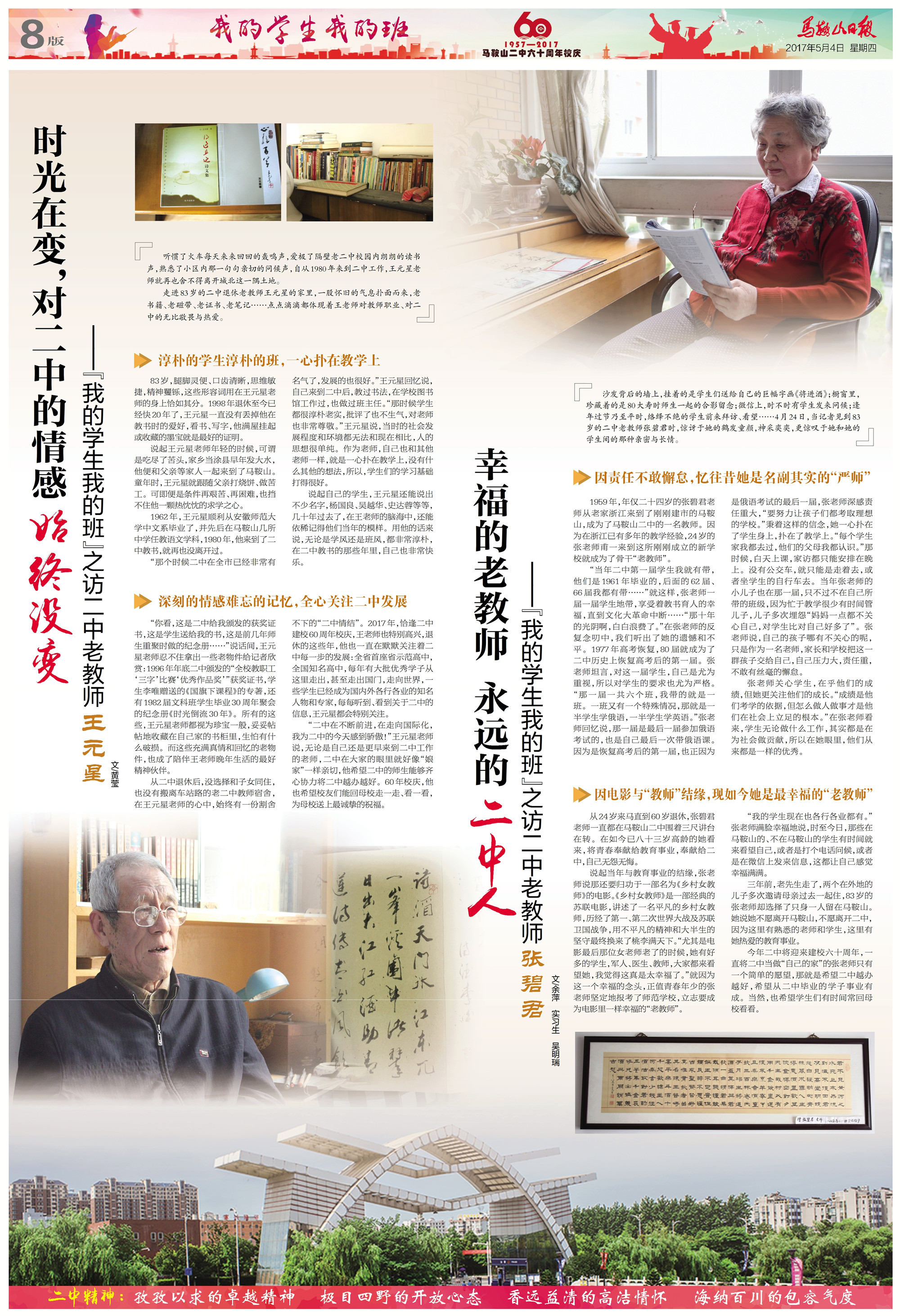 從二中(zhōng)退休後,沒選擇和子女同住,也沒(méi)有搬離車站路的老二中教師宿舍,在王元星(xīng)老師的心中,始終有一份割舍不下的“二中情結”。2017年,恰逢二中建校60周(zhōu)年校(xiào)慶,王老師也特別高興,退休的這些年,他也一(yī)直在默默關(guān)注著二中每一步的發展(zhǎn):全省首座省示範高中,全國知名高中,每年有大批優秀學子從(cóng)這裏走出,甚至走出國門,走向世界,一些學生已經成為國內(nèi)外(wài)各行各業(yè)的知名人物和專家,每每聽到、看到(dào)關於二中的信息,王元星都會特別關注。