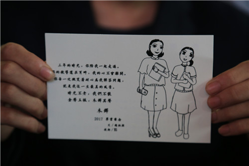 320班戴雨(yǔ)晨同學帶領全(quán)體高三學生進行畢業宣誓。宣誓(shì)後,同學們逐個從郭校長手中接過畢業紀念卡,經過畢業門走出會場。畢業(yè)門(mén)兩旁(páng),是手持鮮花(huā)的教師,他們目送學生離去。許多學生依依不舍地與教師握手、擁抱,表達這份深深的師生情。