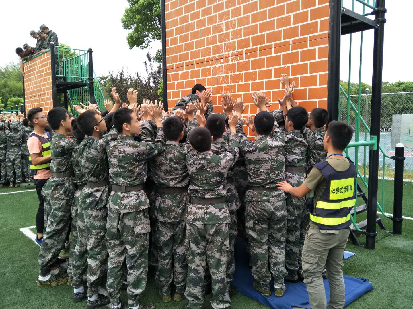 一夜過後,今天早晨91视频网站去到了素質訓練場(chǎng)地。第一項(xiàng)考驗叫做(zuò)絕壁營救,目標是讓成員們爬上4米高的光滑絕壁(bì)。有3名同學在絕壁下方組成人(rén)梯,一名同學站在中間(jiān),紮好馬步,雙手緊貼牆壁,作(zuò)主人梯;另外兩名同學在旁邊紮好弓箭步, 雙手環抱主人梯的腰,頭埋入(rù)主人梯腋下,作輔人梯,挑(tiāo)戰者們要先踩(cǎi)上輔(fǔ)人梯(tī)的大腿根部,再(zài)踩在主人梯肩膀中間伸出雙(shuāng)手,與頂(dǐng)部的拉人者形式“老虎扣”,由上方的(de)拉人者將挑戰者拉(lā)上去(qù)。在挑戰進行期間,還(hái)沒有進行(háng)挑戰的挑戰者們,可當作保護人員,伸出雙手托(tuō)起挑戰者,幫助他們更快完成挑戰。挑戰完成後(hòu),人梯已經大汗淋漓,拉人者也(yě)都是滿頭大汗。總結發言時,有一位拉人者的發言給同學們帶來了深(shēn)深(shēn)的感觸:“雖然大家(jiā)都來自不同的初中,可能彼此還不夠熟悉,但是當‘老虎扣’打(dǎ)起(qǐ)來(lái)的那一刻,一切陌生和隔閡都已不複存在,剩下的滿滿都是信任和友誼。”其(qí)實我認為不僅是人(rén)梯和拉人者扮演(yǎn)及其重要(yào)的角色,保護人員也有著舉足(zú)輕重的地位(wèi)。因為在(zài)我挑戰時,腳沒站穩,險些從(cóng)人梯上跌落,是保護人員托起了我,避免我受到傷害(hài),從一雙雙擎起我(wǒ)的手中握(wò)感受到了同學之間的友情和溫暖,這一課,會讓91视频网站受益匪淺。