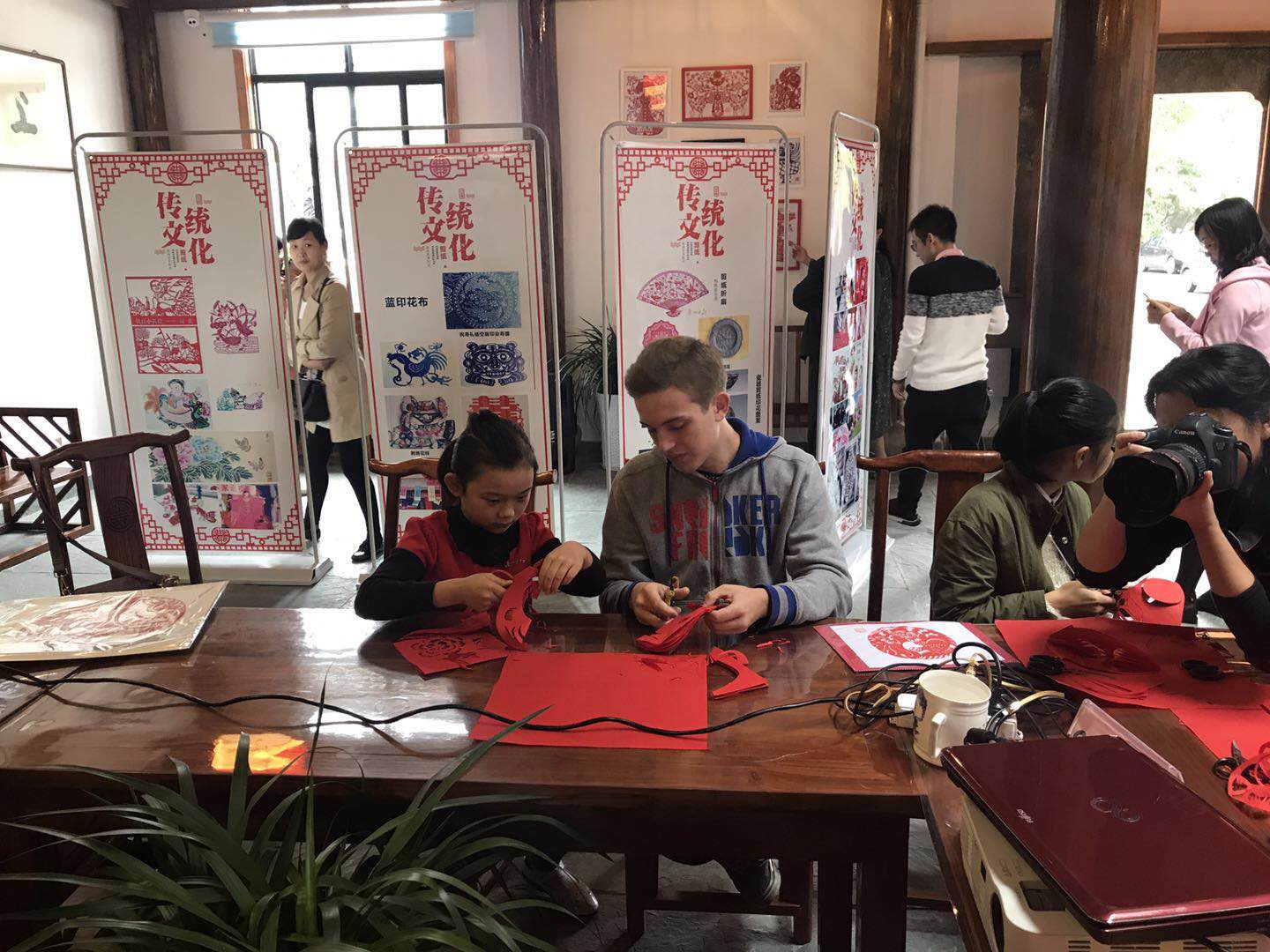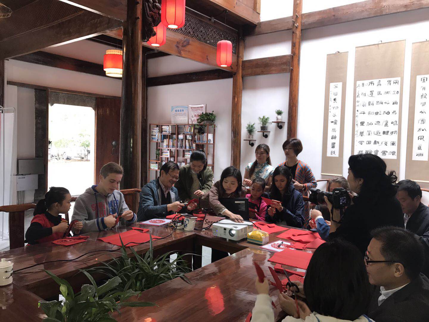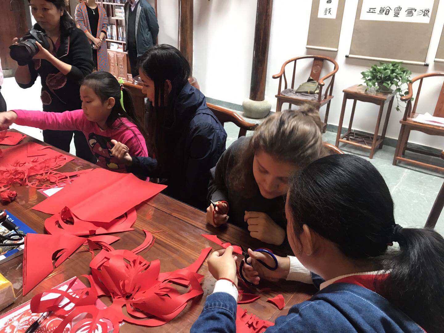 該活動由二中AFS留學生接待家庭家長王慧主持。胡書記首先歡迎各位嘉賓的到來,介紹了市圖書館閱(yuè)讀推廣工作的情況及城市“悅”書房發展的(de)遠景。隨後,郭校長就此(cǐ)次文(wén)化交流活動的意義和大家(jiā)進(jìn)行了交流和探討,著重強調中(zhōng)外文化交流與館校交流對於當代中學生長遠發展的積(jī)極意義(yì)。活動現場,大家在李青媛老師的指導下,紛紛(fēn)拿起了剪刀、紅紙,一(yī)起交流學習,場麵溫馨和諧,被濃濃的中國(guó)傳統民間藝術(shù)氛圍籠罩,中外(wài)友人攜手徜徉在瑰麗的剪(jiǎn)紙藝術殿堂中(zhōng)。