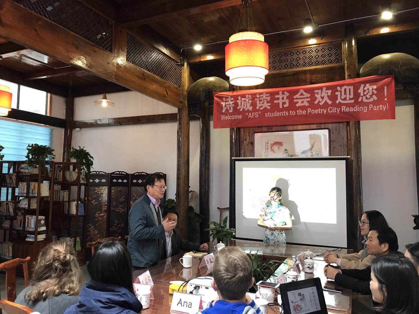 1014日上午9點, 由市二中(zhōng)和市圖書館主辦,詩(shī)城讀書會、城市“悅”書房——桂園書房承辦(bàn)的“AFSERS走進中國剪紙”中國文化(huà)交(jiāo)流(liú)活動,在(zài)桂園城市“悅”書房舉辦。本次活動特邀請市二中校長郭惠宇、國際部主任孫濱、剪紙名家及國家級優秀教師李青媛老師、市圖書(shū)館支部書記胡俊、國際交流生等相關領導和人員出席。
